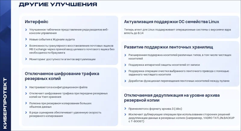 Помимо этого, «Кибер Бэкап» 18.0 включает ряд других значительных усовершенствований: расширенную совместимость со сторонними системами дедупликации резервных копий, улучшенные механизмы оповещения и аудита, контроль нагрузки на вычислительные ресурсы агента при защищённой передаче данных, а также поддержку ленточных накопителей.