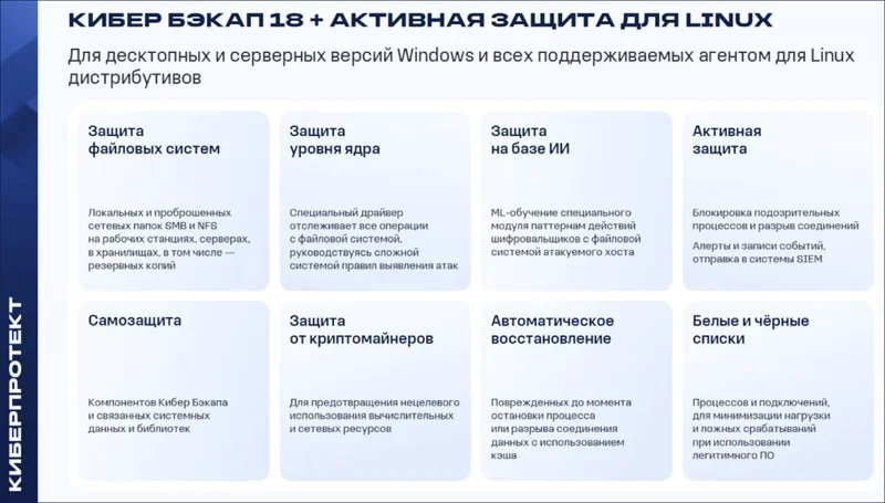 Также разработчики расширили совместимость с операционными системами Linux — теперь «Кибер Бэкап» работает с версиями ядра до 6.14 включительно. Дополнительно в агент для Linux интегрирован компонент активной защиты от шифровальщиков, способный идентифицировать характерные поведенческие шаблоны вредоносных программ. Этот модуль может в режиме реального времени обнаруживать подозрительную активность, блокировать процессы и разрывать сетевые соединения, а также автоматически восстанавливать изменённые файлы.