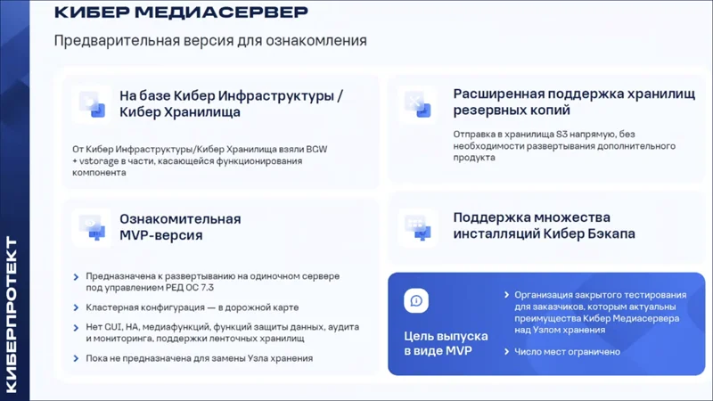 В дистрибутив «Кибер Бэкап» 18.0 включена MVP-версия нового медиасервера «Кибер Медиасервер», который в перспективе должен сменить текущий «Узел хранения» — основной медиасервер системы, отвечающий за централизованный доступ к резервным хранилищам, их безопасность, масштабируемость (включая географически распределённые инфраструктуры) и выполнение других задач, связанных с хранением резервных данных.