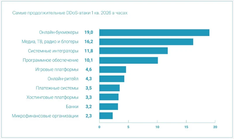 Наибольшее количество DDoS-атак в первом квартале 2026 года пришлось на секторы «Финтех» (44,2 %), «ИТ и Телеком» (19,3 %) и «Онлайн-ставки» (10,0 %): в сумме эти три направления составили почти три четверти всех зафиксированных киберкампаний. Далее следуют «Медиа» (8,8 %), «Электронная коммерция» (6,6 %), «Образовательные технологии» (5,9 %) и «Игры» (1,4 %). Среди микросегментов, которые чаще всего подвергались атакам, выделяются «Банки» (22,8 %), «Платежные системы» (15,9 %), «Онлайн-букмекеры» (10,0 %), «Хостинговые платформы» (6,8 %) и «Системные интеграторы» (6,4 %).