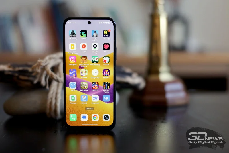 В целом устройство выглядит вполне достойно — например, чёрная версия, которую мы тестировали, приобретает лёгкий налёт элегантности благодаря позолоченной окантовке вокруг блока камер и мерцающему покрытию задней панели. Материалы, как и ожидалось, бюджетные — пластик и закалённое стекло без указания конкретного производителя.