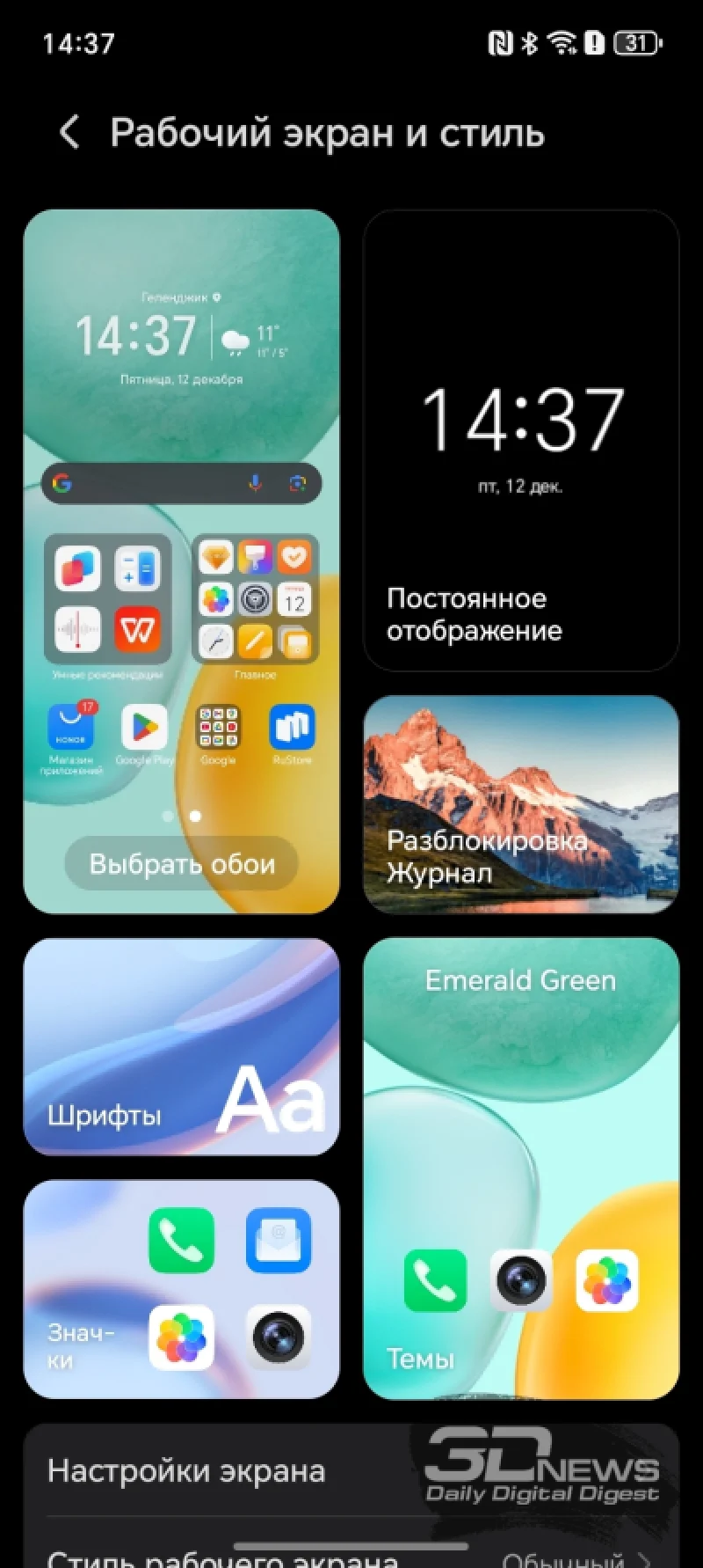 Данная тема уже неоднократно обсуждалась. Внешне (и в большинстве своих возможностей) она почти не выделяется на фоне предыдущих версий, однако получила новую систему генерации фонов для главного экрана и экрана блокировки, а также улучшенные механизмы защиты. Особых характеристик, присущих именно недорогим аппаратам этой марки, не наблюдается — лишь сокращенный набор функций на основе искусственного интеллекта (фактически почти отсутствующий) и более простые параметры для кастомизации внешнего вида (включая обои).