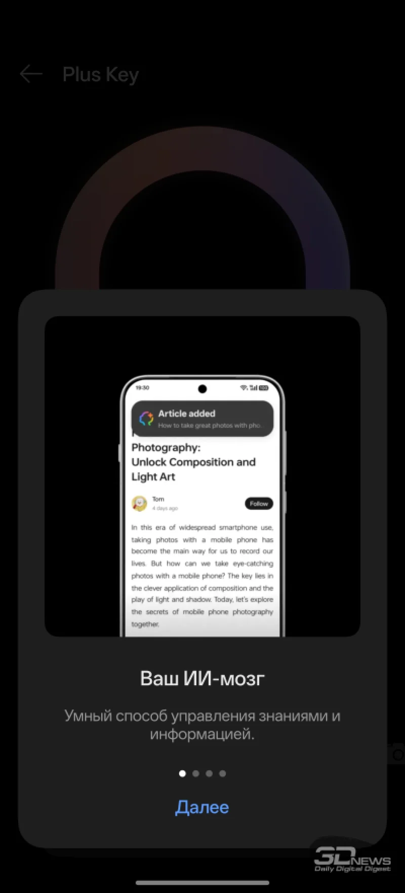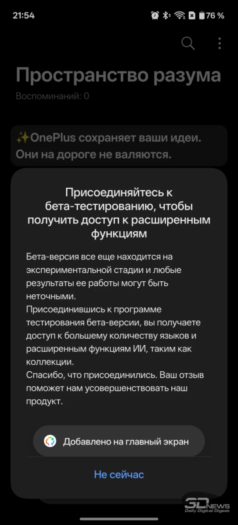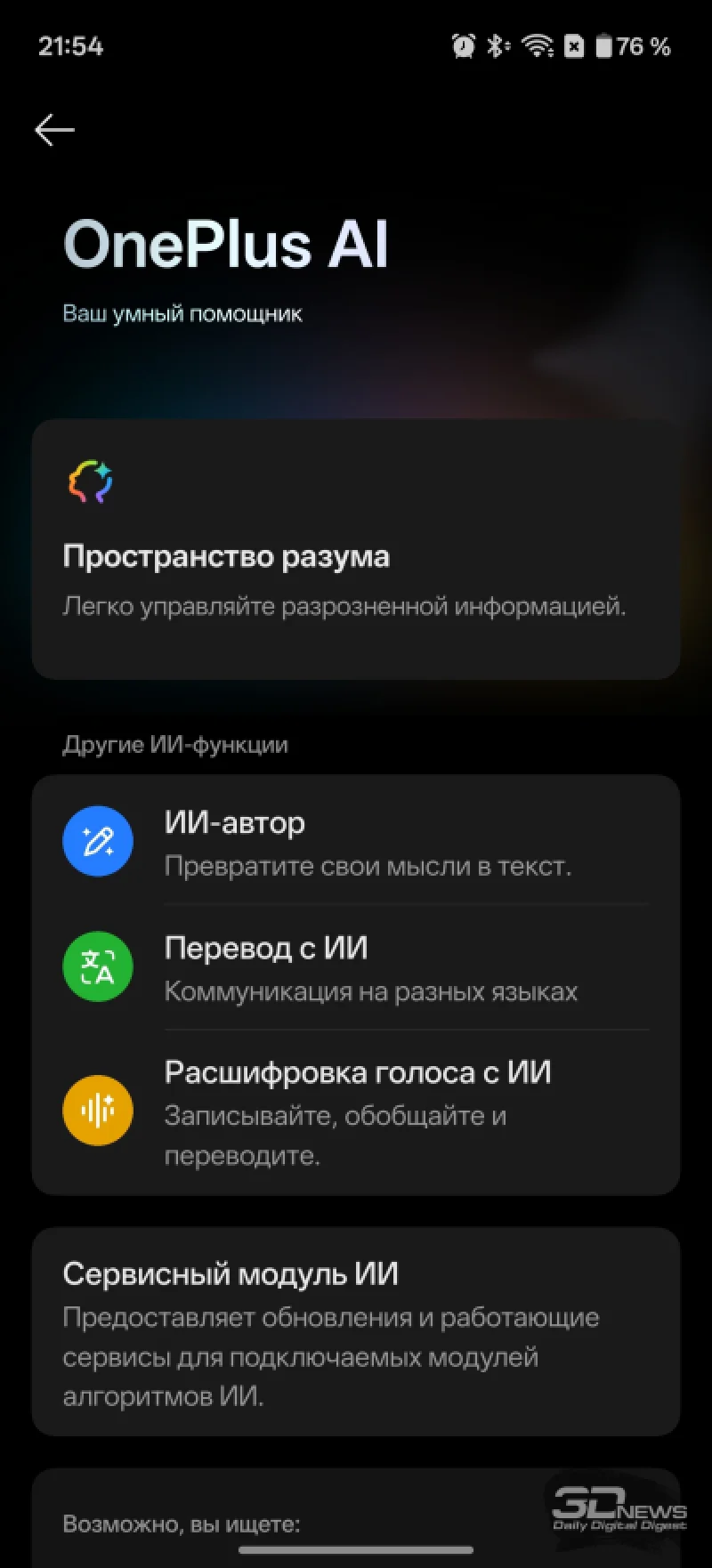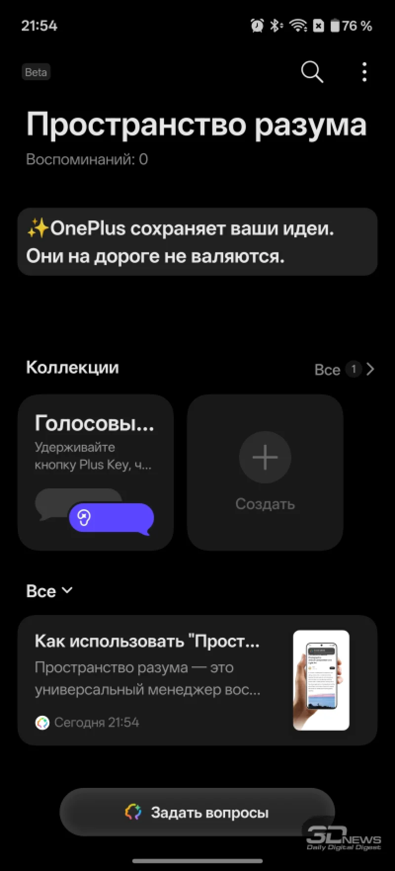 Среди элементов управления стоит выделить дополнительную кнопку Plus Key на левом торце. Ей можно назначить различные действия: переключение звуковых режимов, управление камерой и другие. Кнопка различает одиночное, двойное и длинное нажатие, что открывает широкие возможности для настройки. По умолчанию она активирует «Пространство разума» — интеллектуальный дневник с элементами ИИ, появившийся в этом году на устройствах BBK, включая OnePlus 15 и realme GT 8 Pro. При длительном удержании в моём случае запускался диктофон, который на смартфонах OnePlus также имеет интересные особенности (о них далее).
