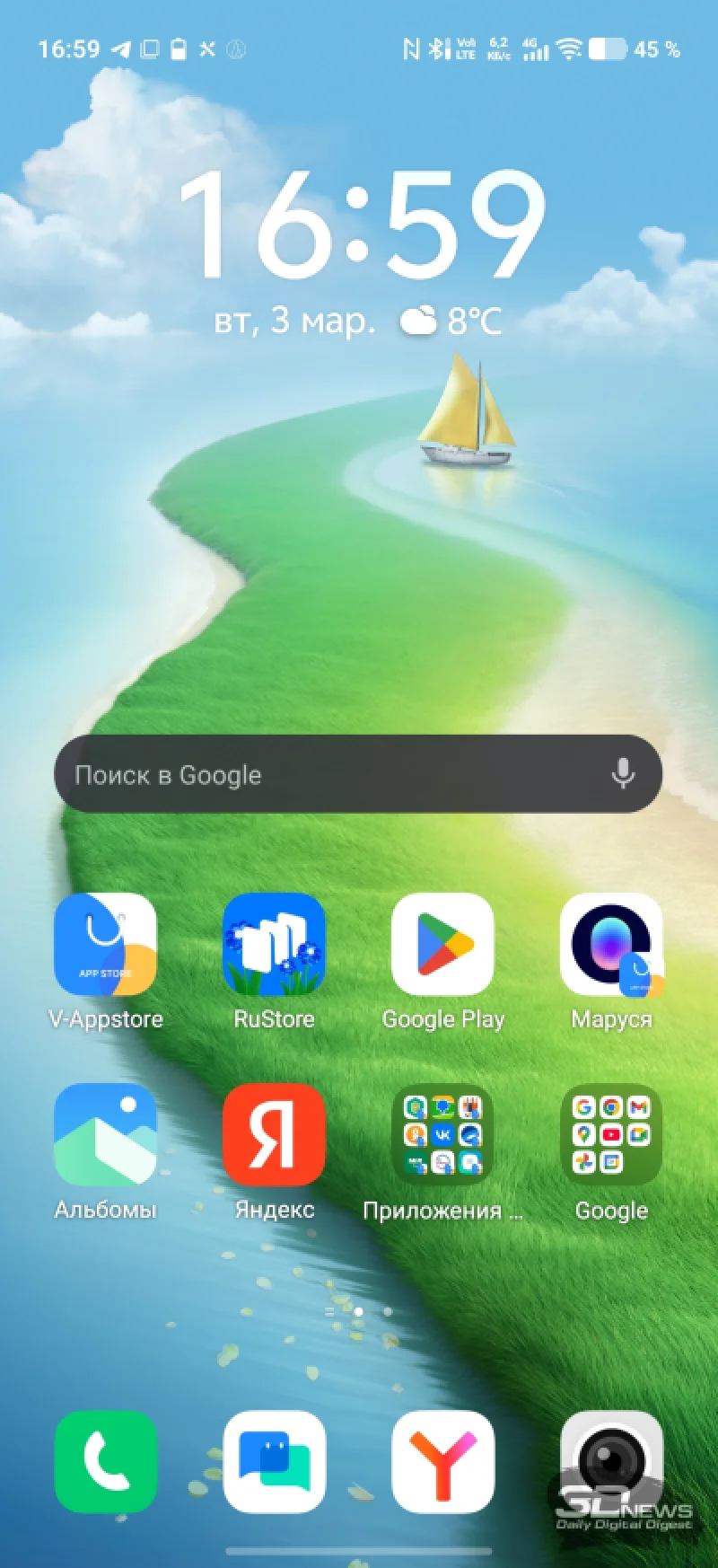 Передняя же панель выполнена традиционно — здесь эксперименты почти не встречаются. Фронтальная камера в отдельном отверстии, минимальные рамки без выраженного «подбородка» — экран занимает свыше 90% площади.