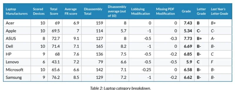 Apple заняла первую позицию в списке производителей ноутбуков с наихудшей ремонтопригодностью, в основном из-за низких оценок за сложность разборки. Кроме того, она, вместе с Dell и Samsung, лишилась 1 балла из-за участия в TechNet и CTA.